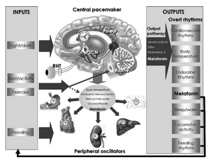 Here’s a nifty graphic showing the “input” and “outputs” of the human circadian system4: