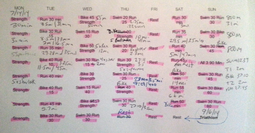 Thankfully I found an 8-week plan designed for runners doing their first tri (me!) that looked reasonable. I taped it to my office door so I would see it frequently. Each night before bed I looked at the next morning’s schedule and mentally framed my preparation and training. After the day’s training session, I highlighted the workout and noted anything that felt significant.