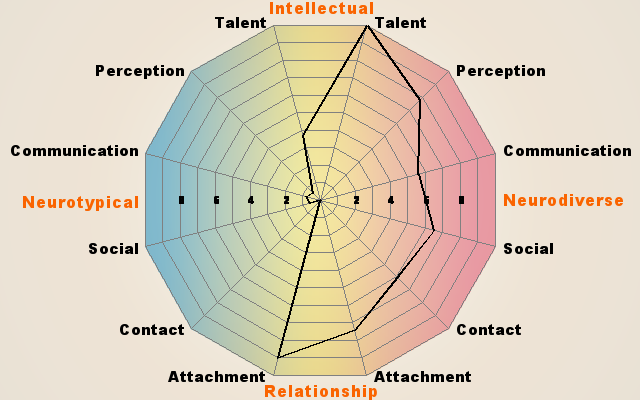 Looking at the Attachment category questions in the PDF, all of the Neurotypical Attachment traits are related to sex. The Neurodiverse Attachment traits, on the other hand, are questionable in their relevance to attachment versus things like language pragmatics and learning social skills through rules. Surely neurotypical people are interested in aspects of attachment other than sex. More importantly, it’s disappointing to see a test of neurodiversity ascribing typical autistic social traits to “attachment disorder.”