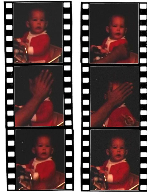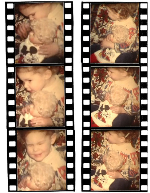 My dad is on the floor in front of me, just outside the cropped frames. At first he’s making noises and I’m laughing. After a few seconds of that, I look up toward the camera, suddenly oblivious to him. Frustrated, my dad puts his hand between me and the camera. Note the unchanged expression on my face before and after. He shakes my shoulder, tickles me, calls me, tries the hand thing a couple more times. Nothing seems to get through to me. I’m still staring at whatever’s caught my attention when the frame goes dark.