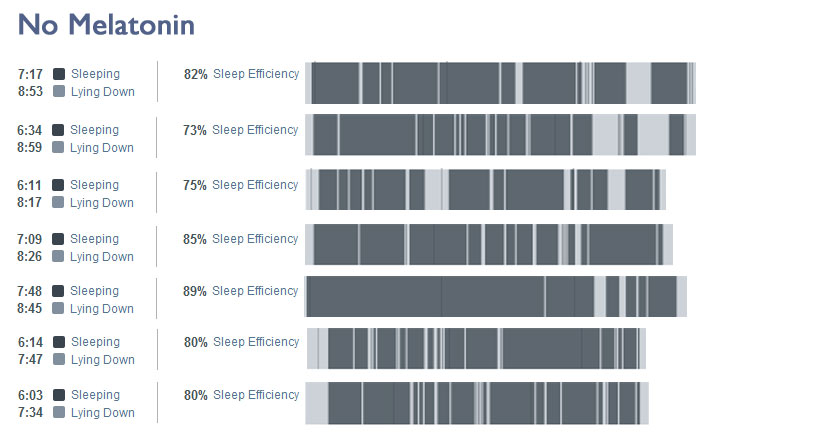 The Scientist hooked me up with an armband that monitors sleep quality. I wore it while I slept for two weeks, one week on the melatonin and one week off. Thanks to the software that came with the armband, here’s a graphic representation of how well I slept during each of the weeks: