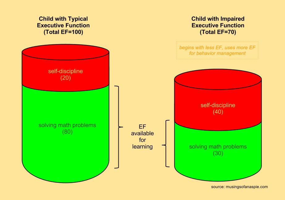 Assume the autistic child has to devote twice as much EF (40 units) to self-discipline. Not only does s/he have to do all of the things the typical child is doing (staying seated, paying attention, not talking to classmates), s/he has to inhibit the natural urge to stim. That means s/he is starting out with less EF and devoting more of that small reserve to self-discipline.